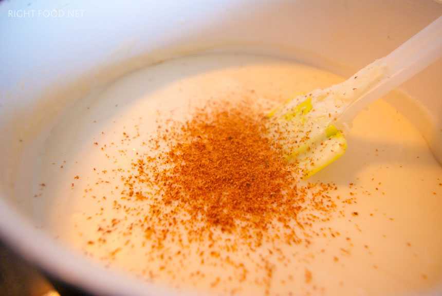 Пришло время заняться вторым соусом. Каннеллони стандартно готовится с соусом Бешамель. Для этого понадобится сотейник либо небольшая кастрюля с толстым дном. На среднем огне растапливаем в нём 50 грамм сливочного масла и всыпаем 40 грамм муки. Перемешиваем всё до однородной массы. Немного её обжариваем в течение 1-2 минут. Данный загуститель приобретёт лёгкий ореховый аромат и слегка пожелтеет. После обжаривания вливаем в сотейник 5оо мл холодного молока и при помощи венчика всё тщательно перемешиваем, чтобы не образовывались комочки теста. Соли, перчим и добавляем немного мускатного ореха. Варим соус до тех пор, пока он не загустеет до кремового состояния.