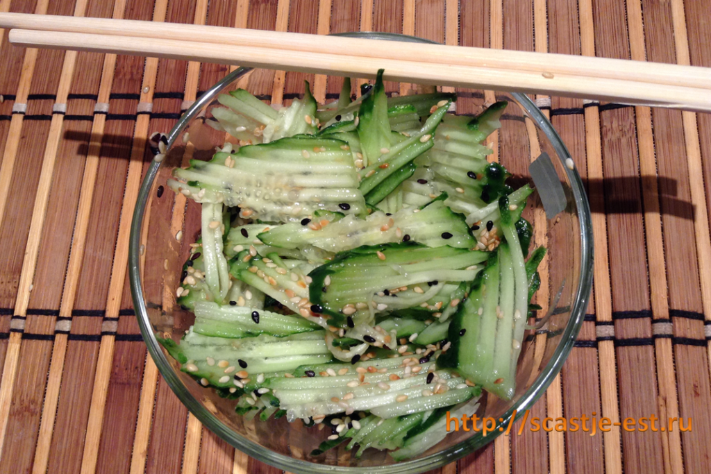 Готовится такой салат за 5 минут, но для того, чтобы огурцы остыли и немного замариновались, его нужно будет поставить хотя бы на 15 минут в холодильник.
