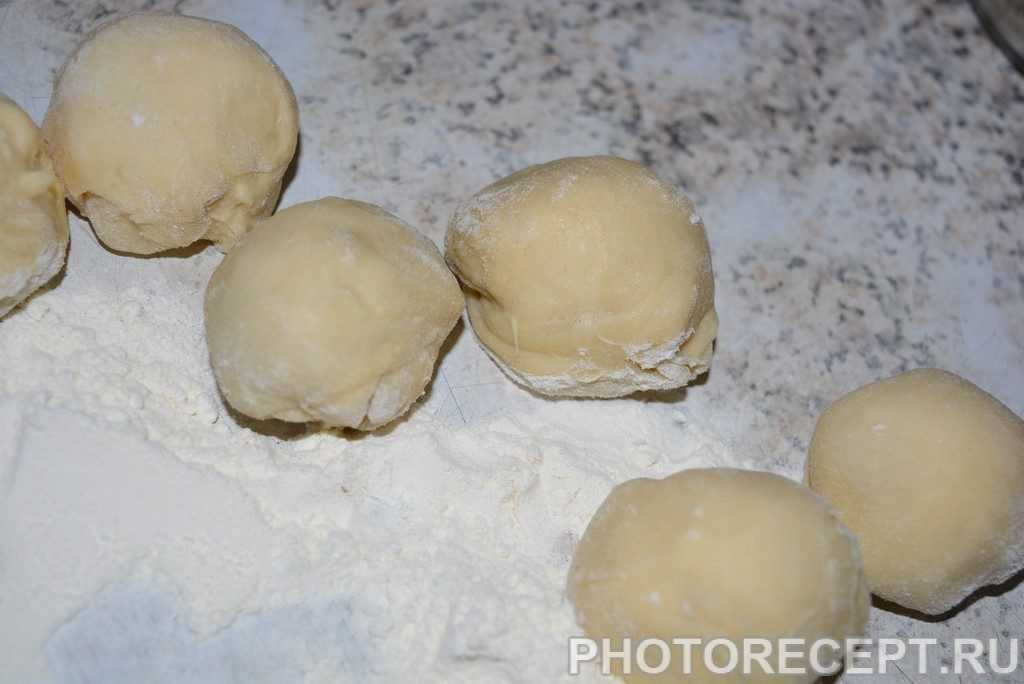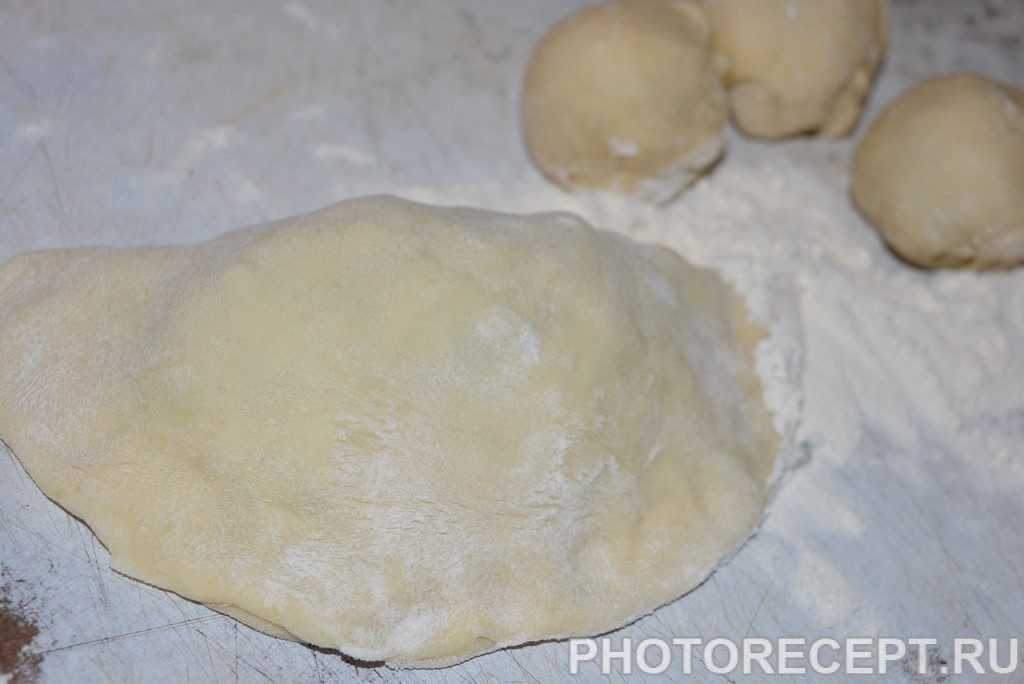 4. Выкладываем готовое тесто на стол и режем на маленькие кусочки. Накрываем пленкой и даем отдохнуть. Каждый кусочек теста раскатываем очень тонко. Начинку выкладываем в каждую лепешку.