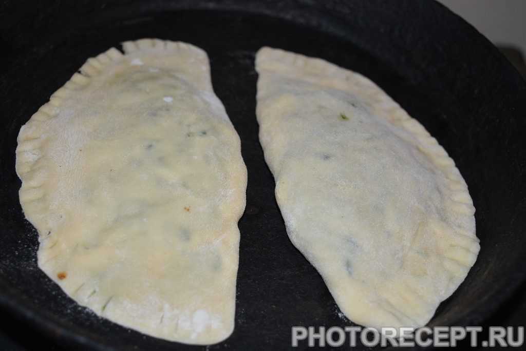 Затем раскатываем тесто в тонкий пласт (нужно дружить со скалкой), берем чайное блюдце и вырезаем из него кружки. Далее на одну сторону лепешки выкладываем ложкой готовую начинку из творога с зеленью, прикрываем другой стороной и защипываем, как чебурек.