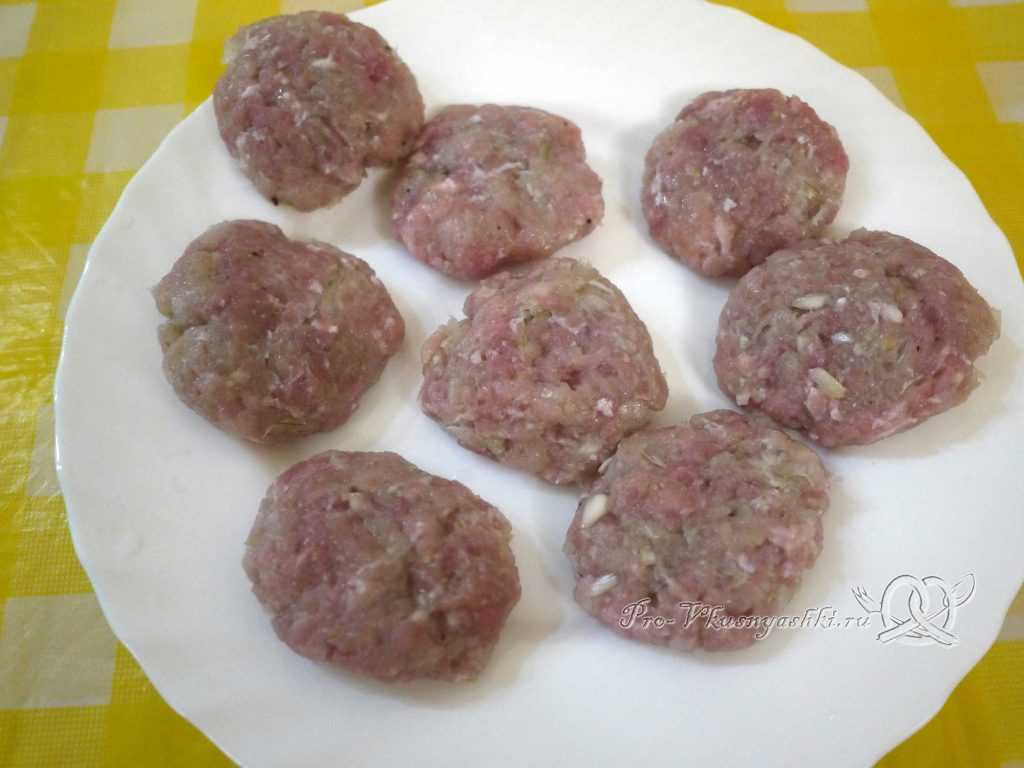Мокрыми руками лепим из фарша мясные шарики размером с грецкий орех и превращаем их в лепешки, сдавив с двух сторон.