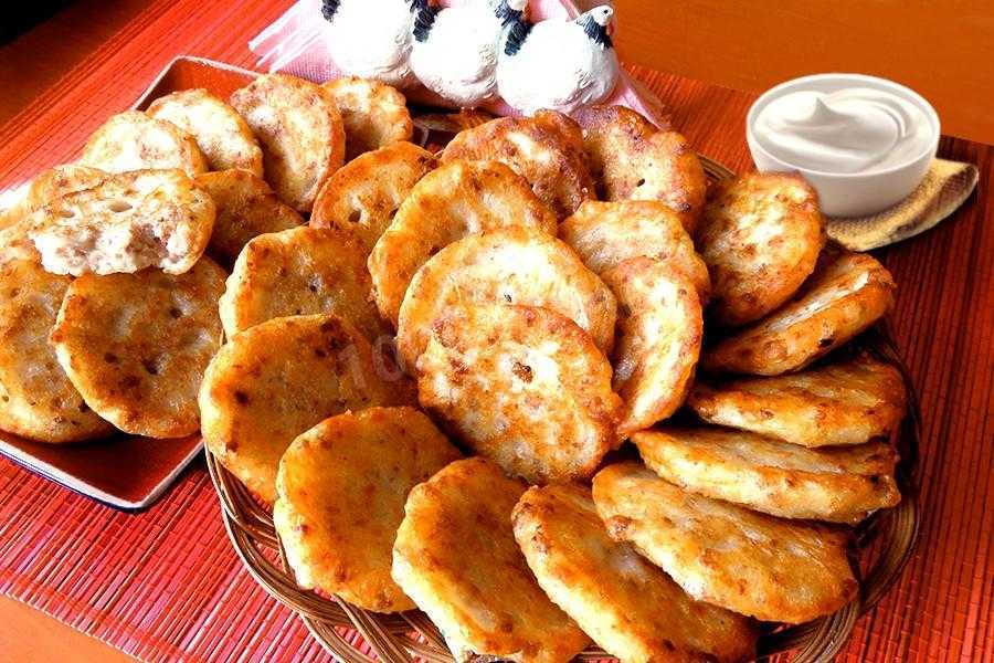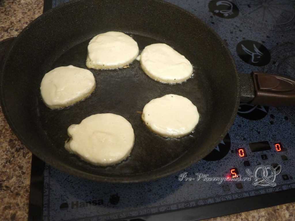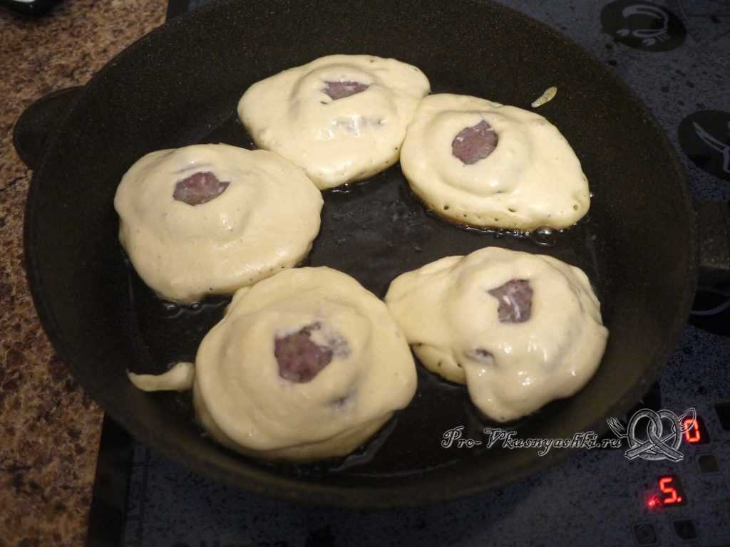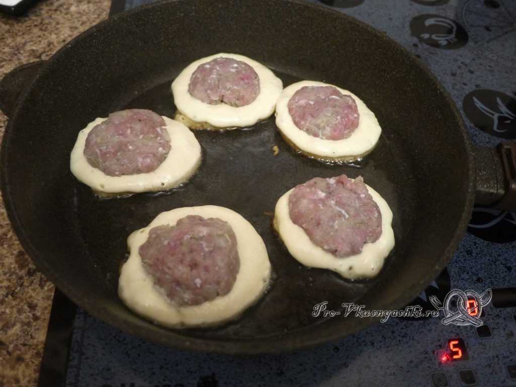 Выкладываем тесто на раскаленную сковороду с маслом в виде оладий, диаметр каждого экземпляра должен быть чуть больше, чем мясные лепешки.