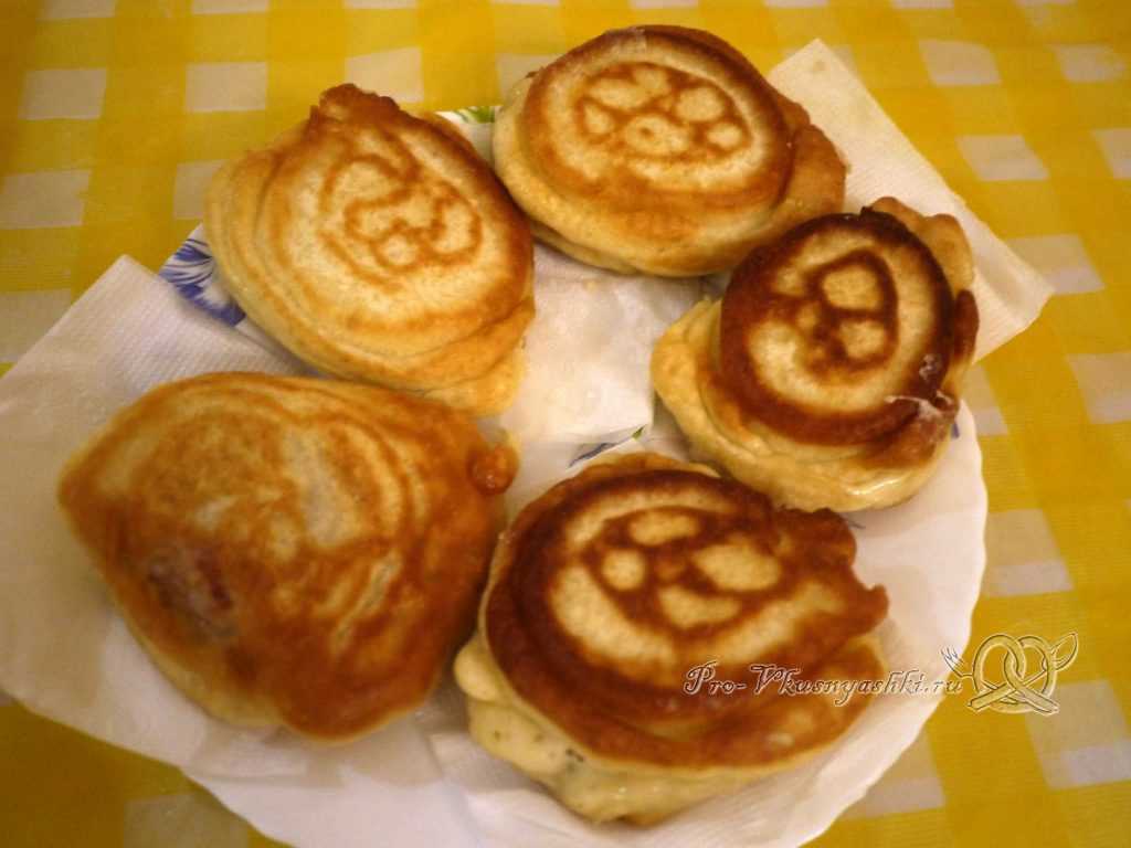 - Налить масло на жаровню, раскалить, затем дырочкой вниз выложить изделия. Чтобы ленивые пирожки прожарились, рекомендуется накрыть посуду крышкой.