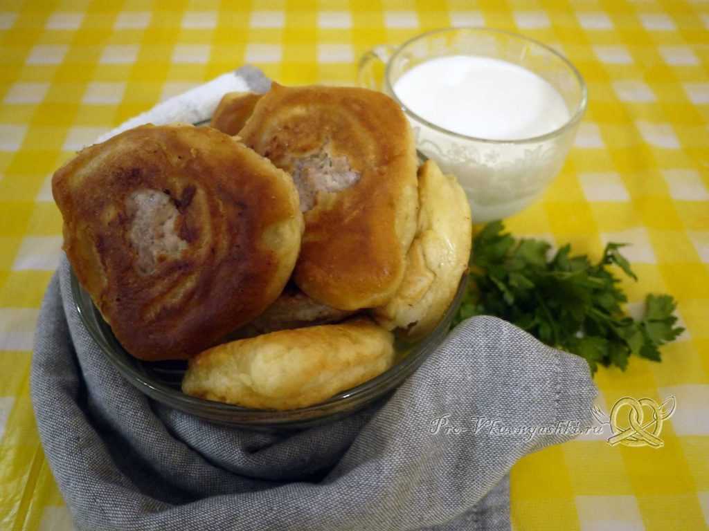 Рецепт можно упростить — сразу добавить начинку в тесто, а затем выкладывать ложкой и жарить, как обычные оладьи. Получаются своего рода ленивые беляши с фаршем внутри, готовятся они еще быстрее, чем в предыдущем случае, без лишних манипуляций. Но вкус и внешний вид будет совершенно другим.