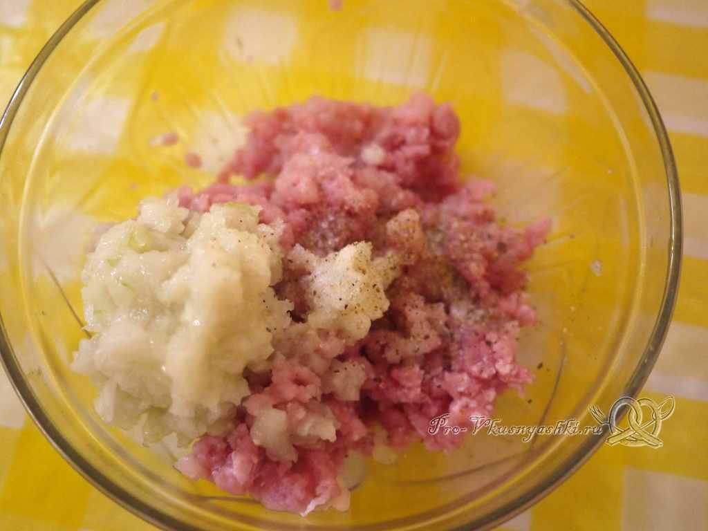 - Для приготовления начинки лук мелко порежьте, соедините его с фаршем и хмели-сунели.