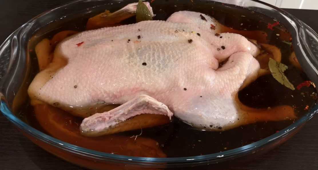 - Вынимаем тушку из холодильника и даем стечь излишкам маринада.