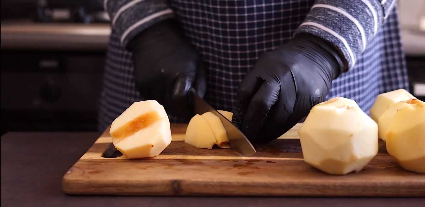 - Сначала вымытые яблоки с кожицей, но без семян режут дольками.