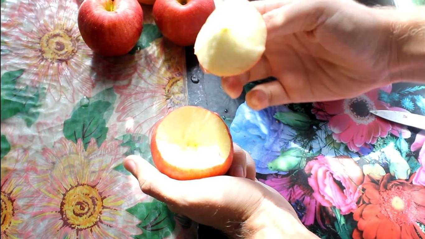Еще раз повторюсь – не покупайте отборные фрукты, это лишняя трата денег. Купите те, что подешевле, но чтоб вкусные были, спелые. Хотя и зеленоватые тоже пойдут, но для них понадобится чуть больше сахара. Ну а если нужно переработать свой урожай, то тут решение само собой напрашивается – из хороших яблок, собранных с дерева, делаем компоты, варенье, сушку, а из тех, что собрали под яблоней – сок, джем и заготовку для пирога. Разрезаем фрукты на четвертинки, удаляем серединку с семенами. Или вырезаем ее специальным ножом.
