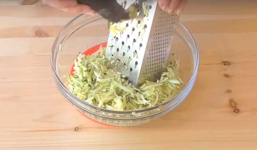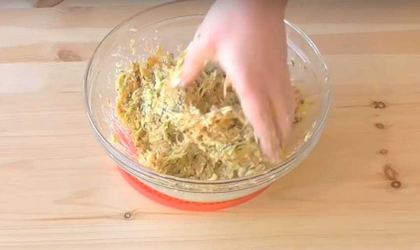 1. Овощи почистите и натрите – кабачок на крупной терке, морковь на мелкой. Сыр тоже натрите отдельно. Добавьте в овощную смесь щепотку соли, оставьте на 20 минут, чтобы выделился сок.