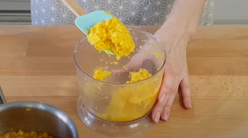 8.Проваренный апельсин выньте из сиропа и перебейте блендером в кашицу.