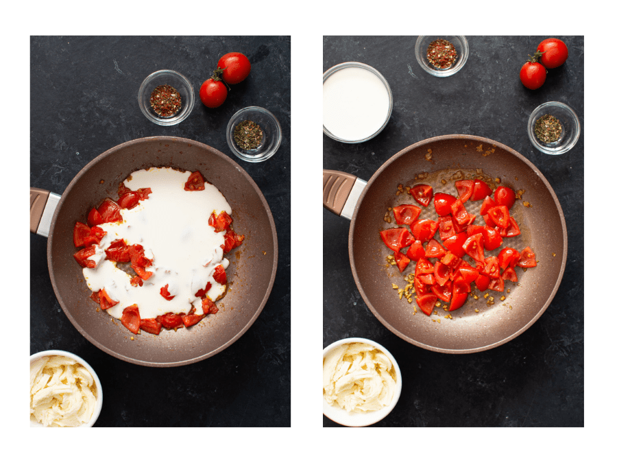Добавляем в лук с чесноком протертые томаты, орегано, базилик, перец и соль, хорошо перемешиваем и даем немного покипеть.