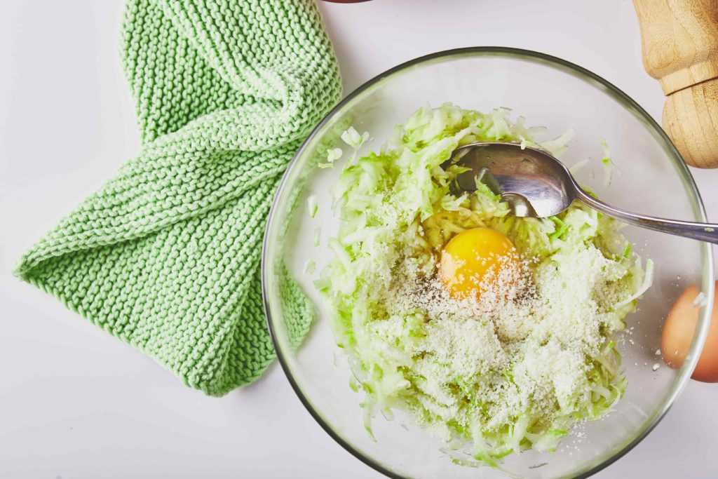 - К отжатым овощам добавляем яйца, измельченный чеснок и сыр, хорошо перемешиваем смесь. По деланию и своему вкусу добавьте молотый перец и рубленую свежую зелень. Посолите и еще раз перемешайте. Тесто готово! Осталось его запечь в духовке или пожарить на сковороде.