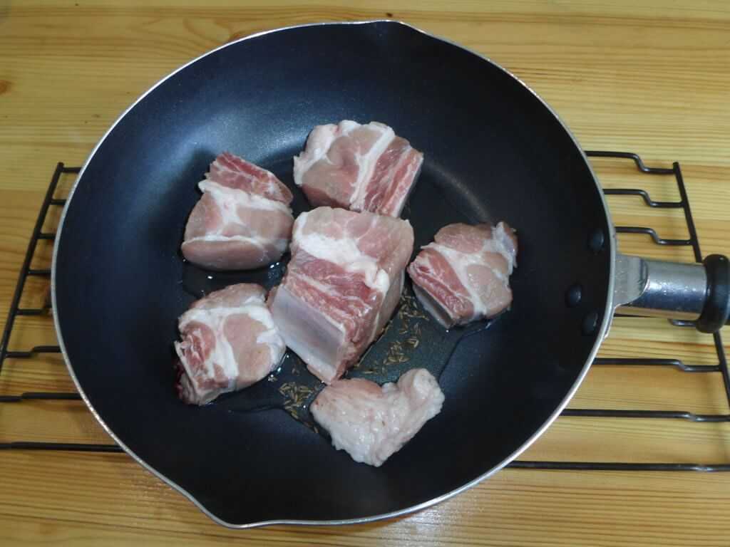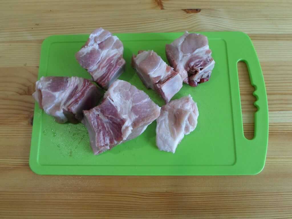 - Пока прогревается сковорода или казан с жиром, нарезаем 500-550 г мяса на средние кусочки или разрезаем ребрышки между косточками. Кладем его на сковородку и обжариваем со всех сторон, пока оно не поменяет цвет.