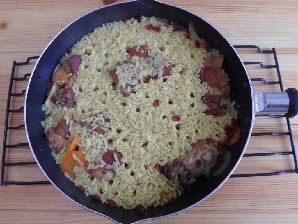 - Промыть сухофрукты. У изюма удалить палочки, курагу нарезать соломкой. Добавить к овощам сухофрукты и специи, всыпать промытый сухой рис. Жарить 5 минут, пока он не станет прозрачным, а окорок не обретет золотистую корочку.