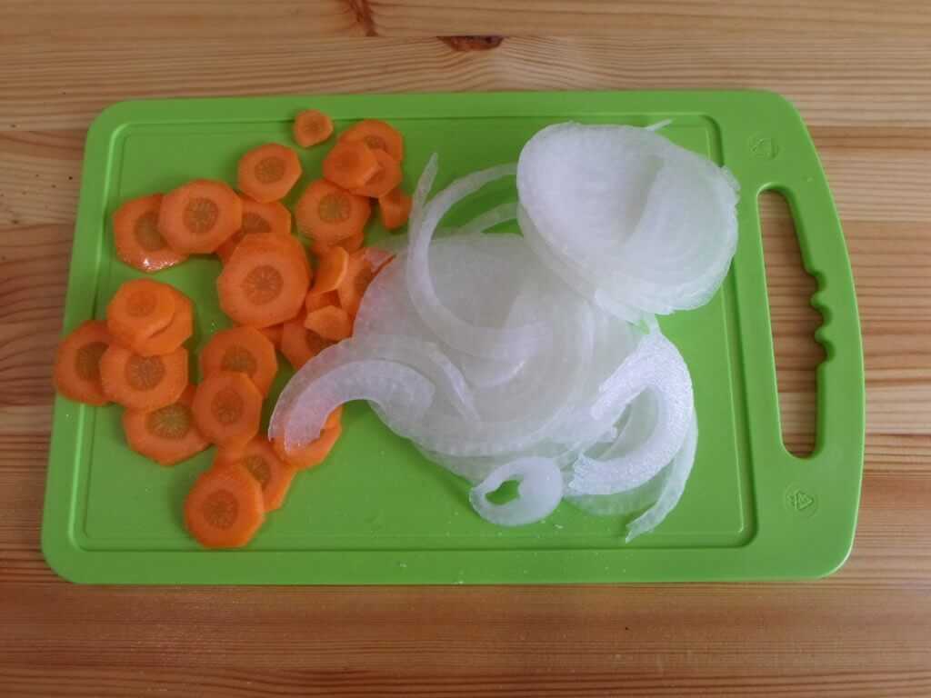 - Нарезать луковицы кубиками, морковку – брусочками.
