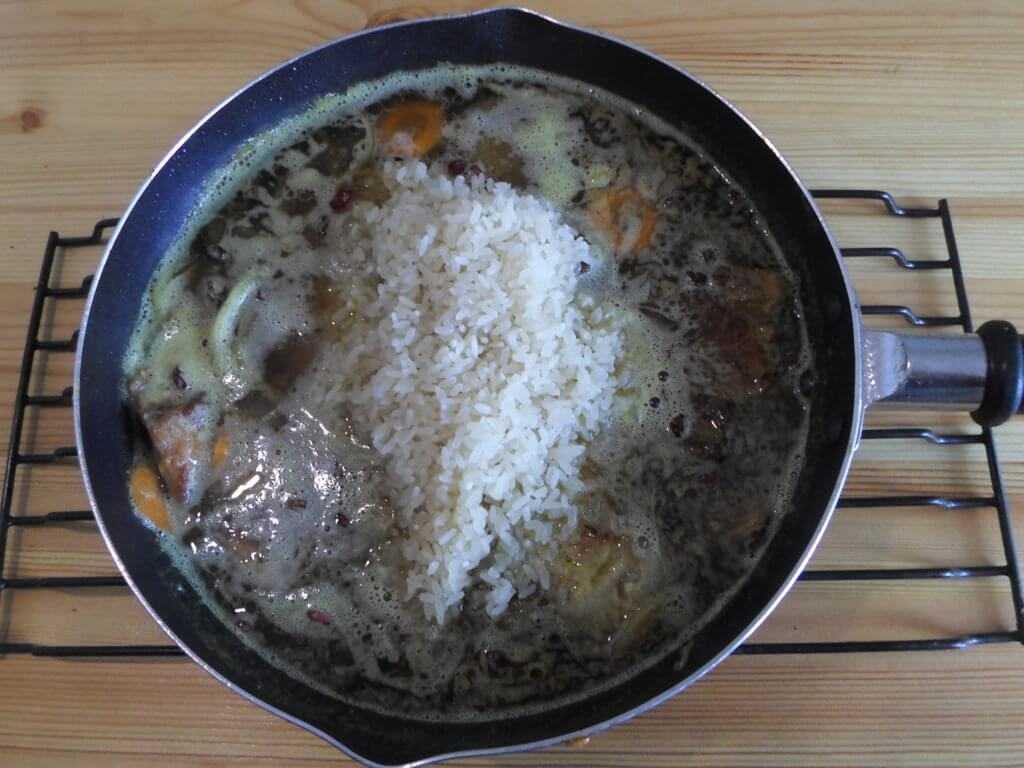 - Наливаем еще три стакана воды. При необходимости разравниваем рис и готовим на умеренно-сильном огне до выпаривания жидкости. Воды у нас ушло немного больше, поскольку ее часть выпарилась в зирваке.