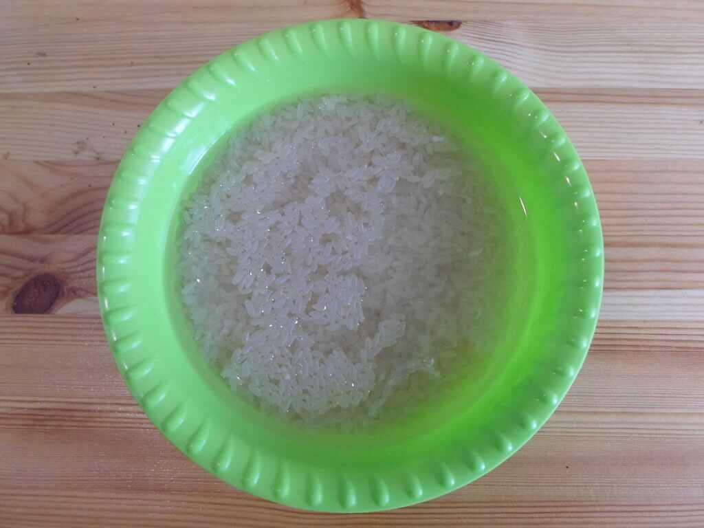 - Равномерно выкладываем на сковороду рис. Поскольку во время готовки мы его совсем не будем перемешивать.