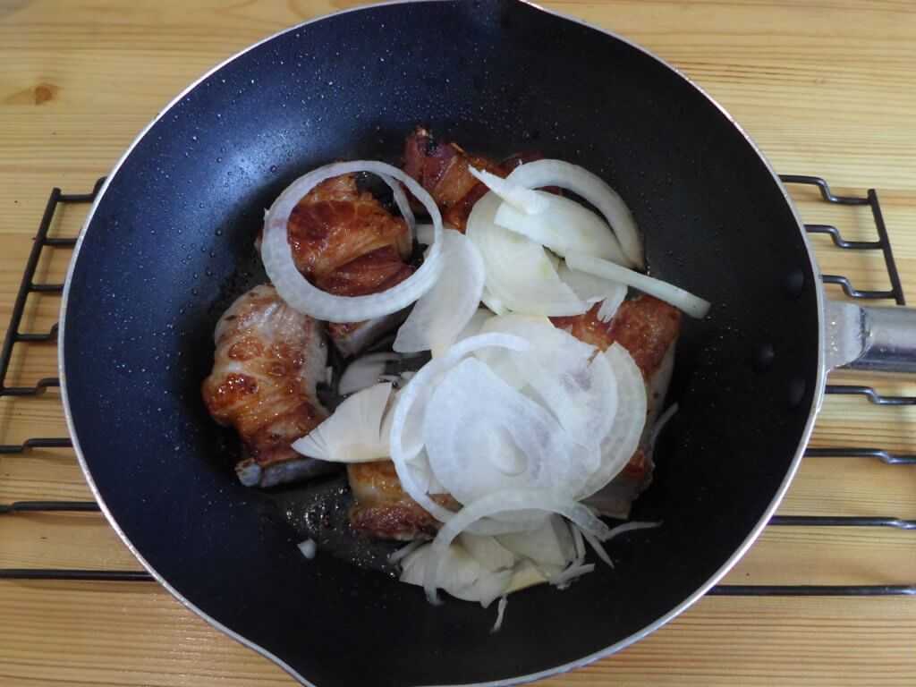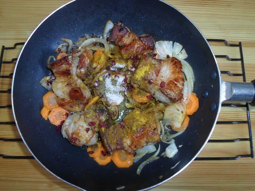 В процессе жарки мясо даст сок, есго можно временно слить со сковородки в отдельную миску. На этапе обжарки мяса поперчите его чёрным молотым перцем.