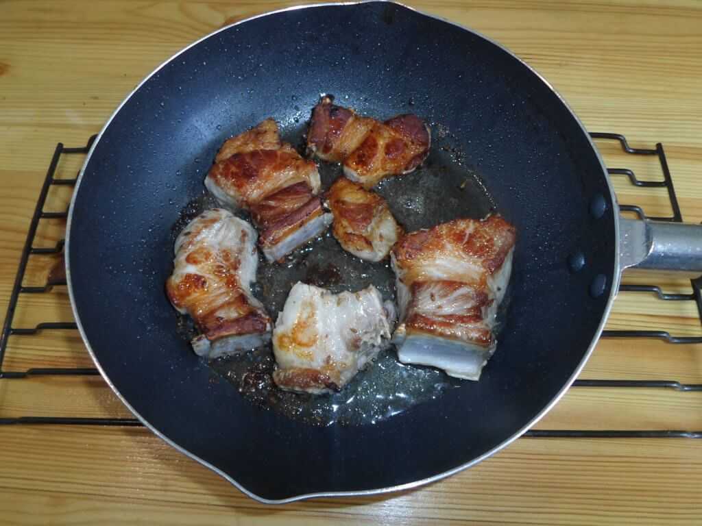 - Срезать со свиного окорока немного сала и растопить на сковородке вместо растительного масла. Окорок порезать средними кусками и отправить жариться на среднем огне 3-4 минуты.