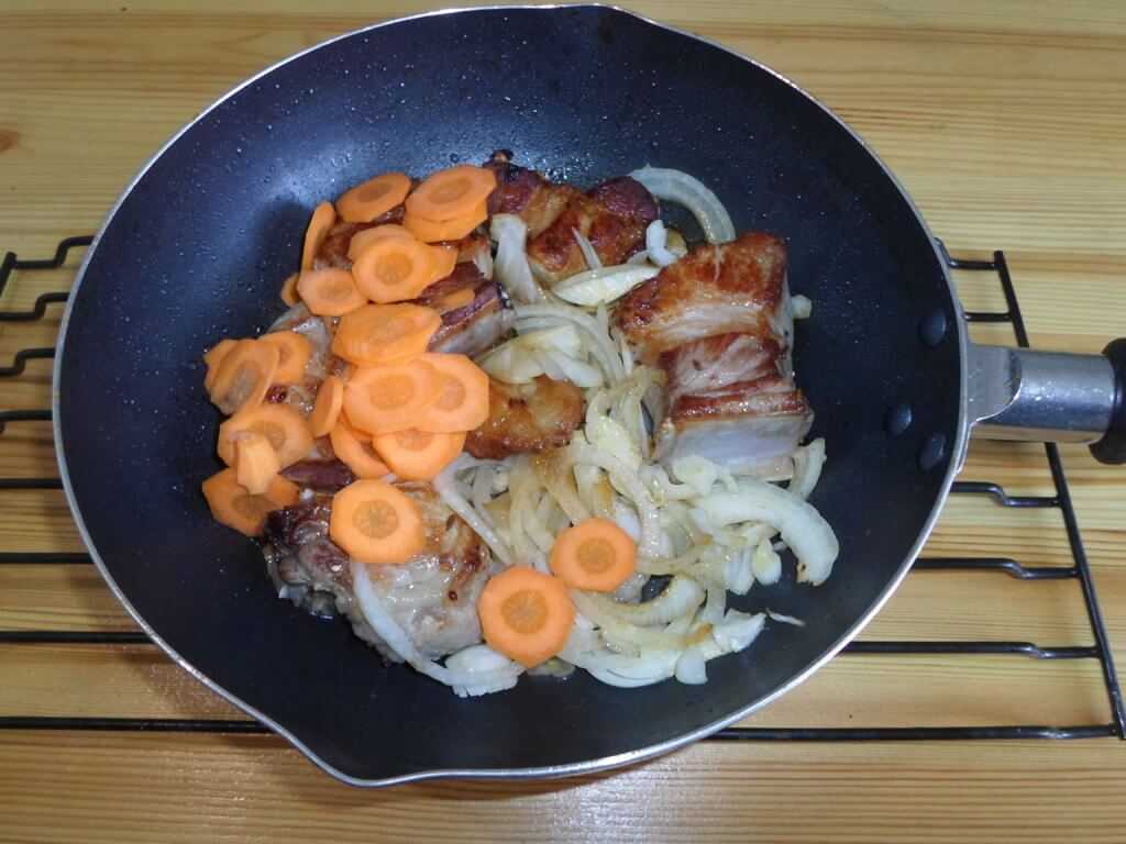 Далее к обжаренной свинине надо влить еще немного растительного масла и всыпать в сковороду измельченный лук. После тщательного перемешивания емкость требуется закрыть крышкой и через несколько минут открыть крышку, снова влить чуть-чуть масла, добавить в смесь морковь и хорошо все размешать. Жариться овощи с мясом должны под крышкой около 3 минут.