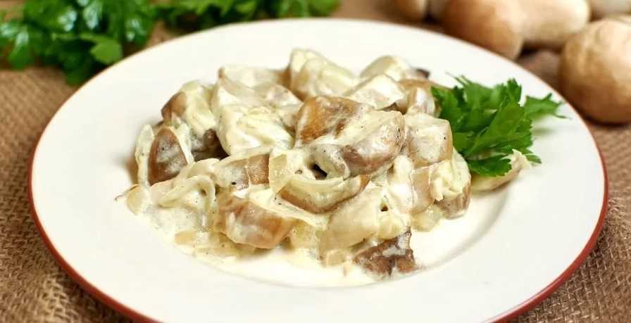 - Если грибы уже зажарились, посолите их и добавьте сметану. Перемешайте будущую подливку.