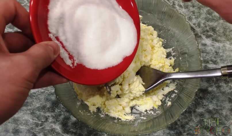 3. Соединяем вместе сахар и соль. Добавляем их в творожно-яичную массу.
