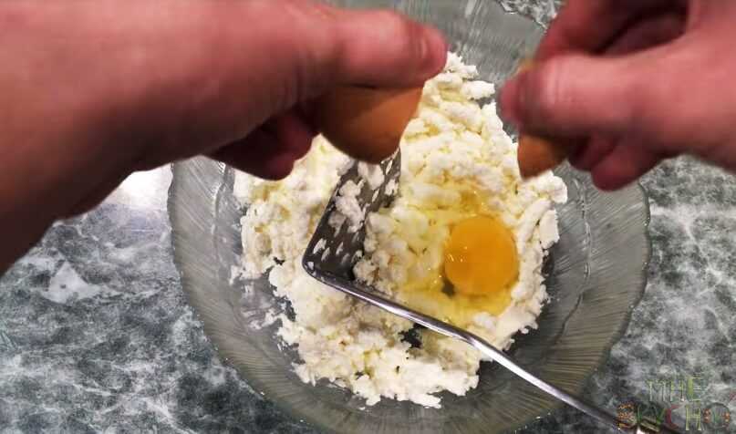 2. Раскалываем туда одно куриное яйцо. Вминаем яйцо хорошо, творог должен будет стать желтоватого цвета.