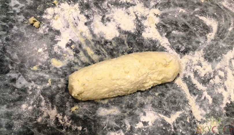 3. Доску или рабочий стол присыпаем мукой. Перекладываем сюда тесто и формируем удлиненный батончик. Главное, не забивать его мукой – она тут нужна только для того, чтобы вам было удобнее формировать массу.