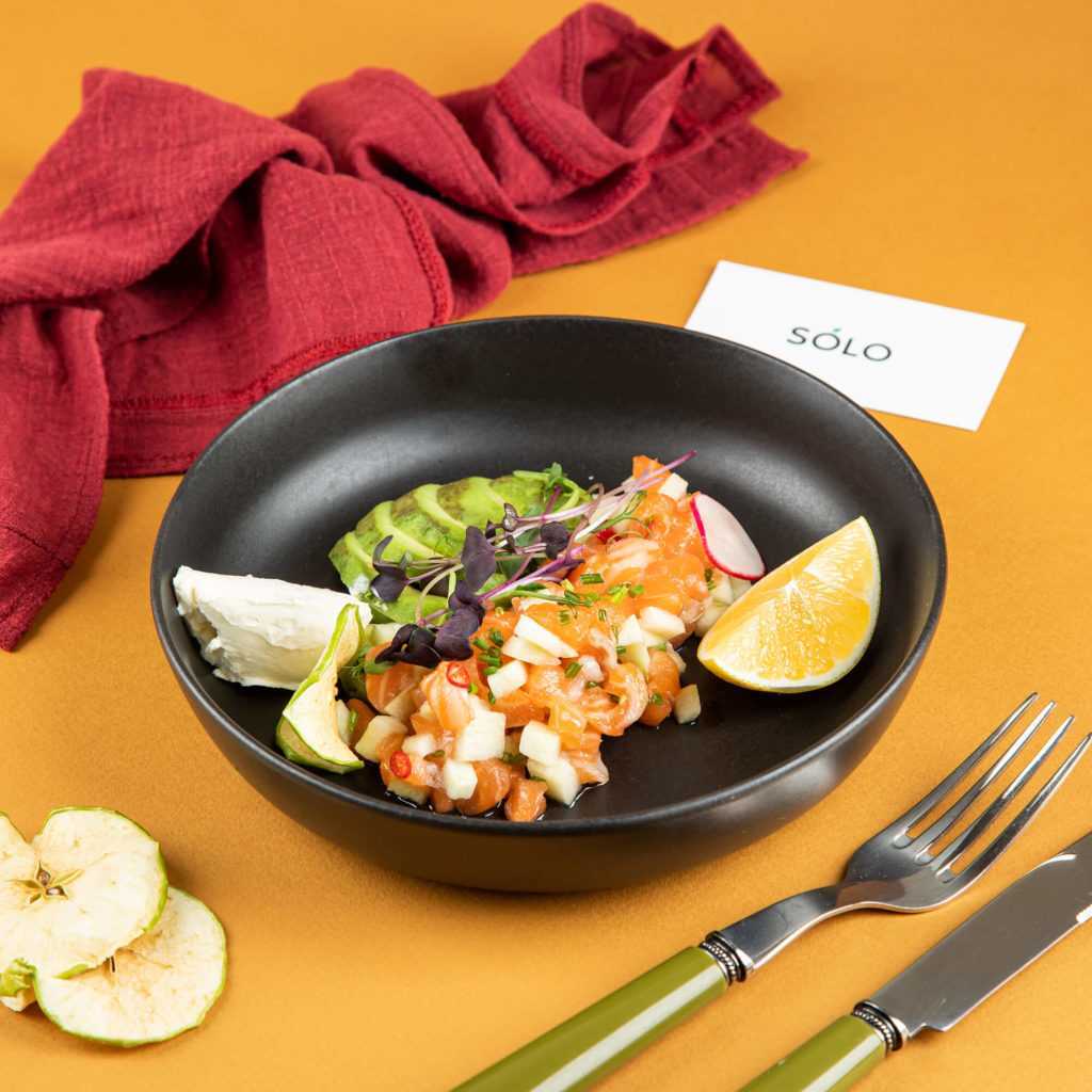 Тартар из норвежского лосося с зелеными яблоками, авокадо Хаас и домашним сыром в программе Solo Family