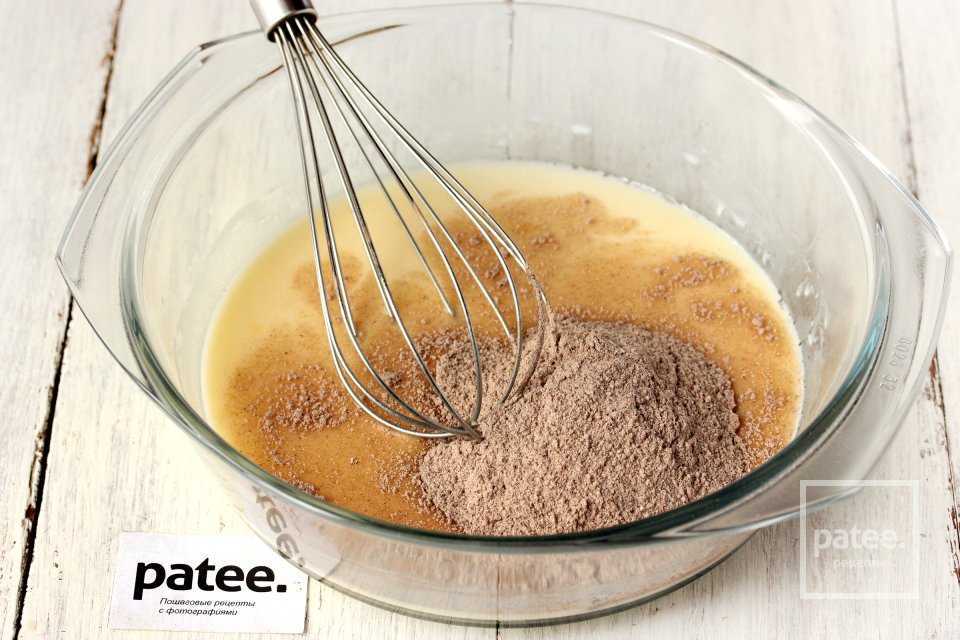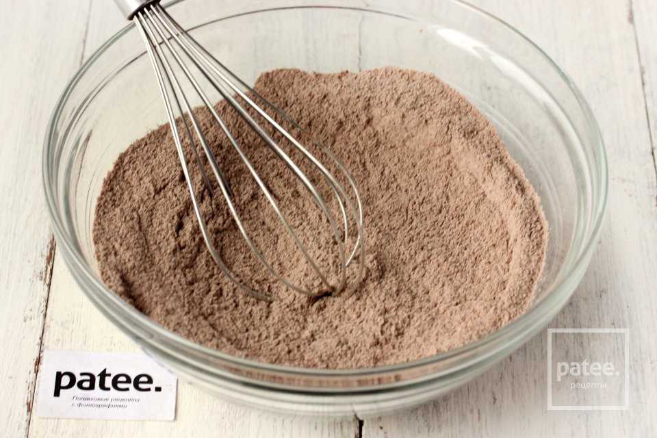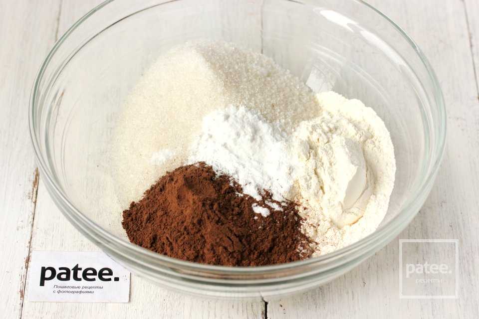- Просейте через сито 280 г муки в глубокую миску, добавьте 100 г какао, чайную ложку соды и 10 г разрыхлителя.