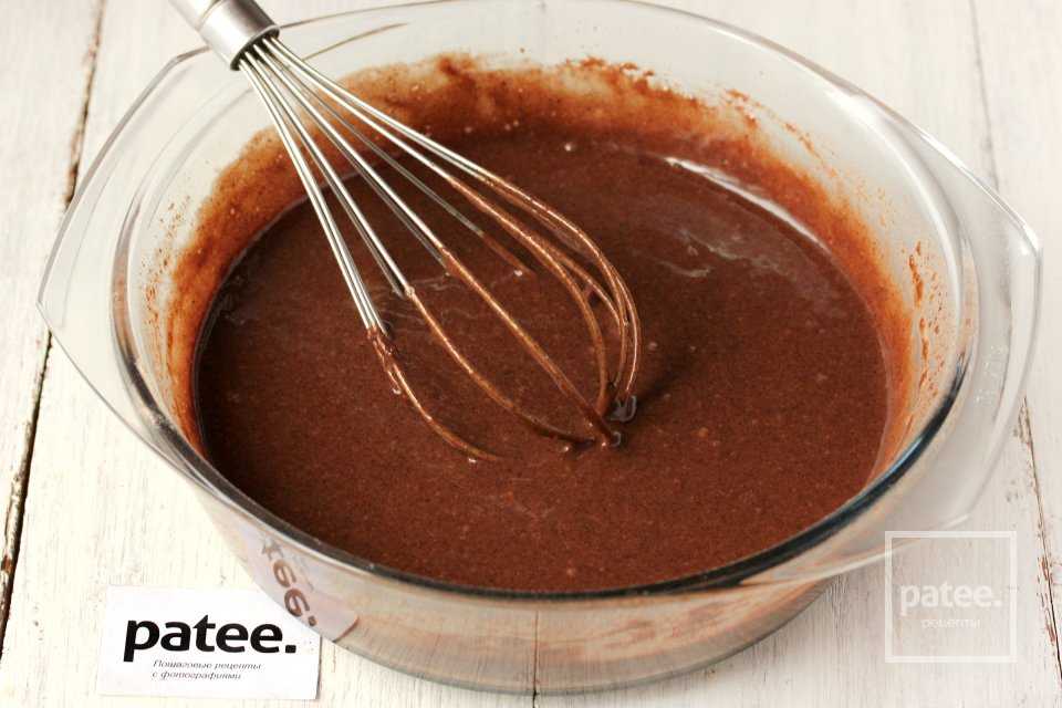Шаг 2. Далее готовим тесто для шоколадного бисквита: по аналогии взбиваем одно яйцо и три столовые ложки сахара, также добавляем соду, гашенную уксусом. Для придания тесту шоколадного цвета добавляем одну столовую ложку какао-порошка. Вводим в смесь две столовые ложки муки и тщательно все перемешиваем.