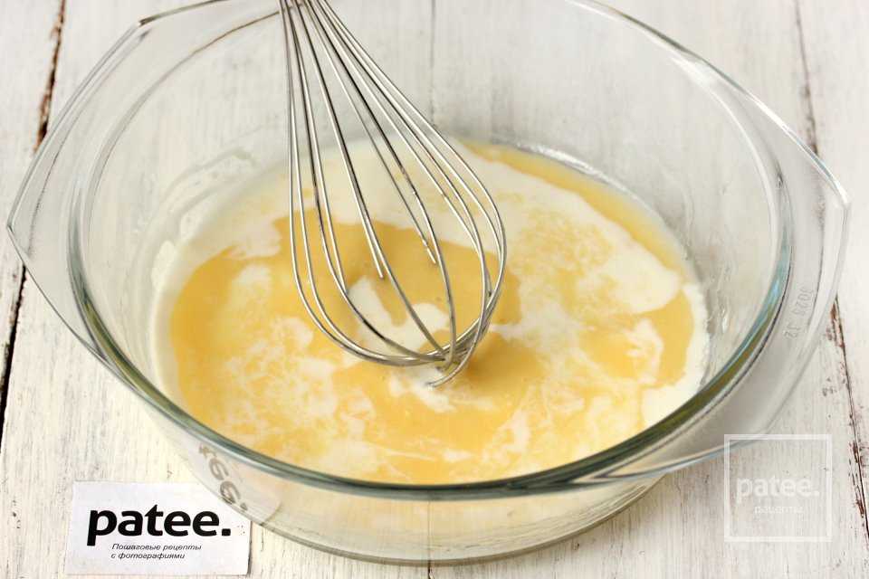 Шаг 2. В глубокой емкости смешиваем соус “Ранч”, 200 миллилитров молока, два куриных яйца и 200 грамм муки.