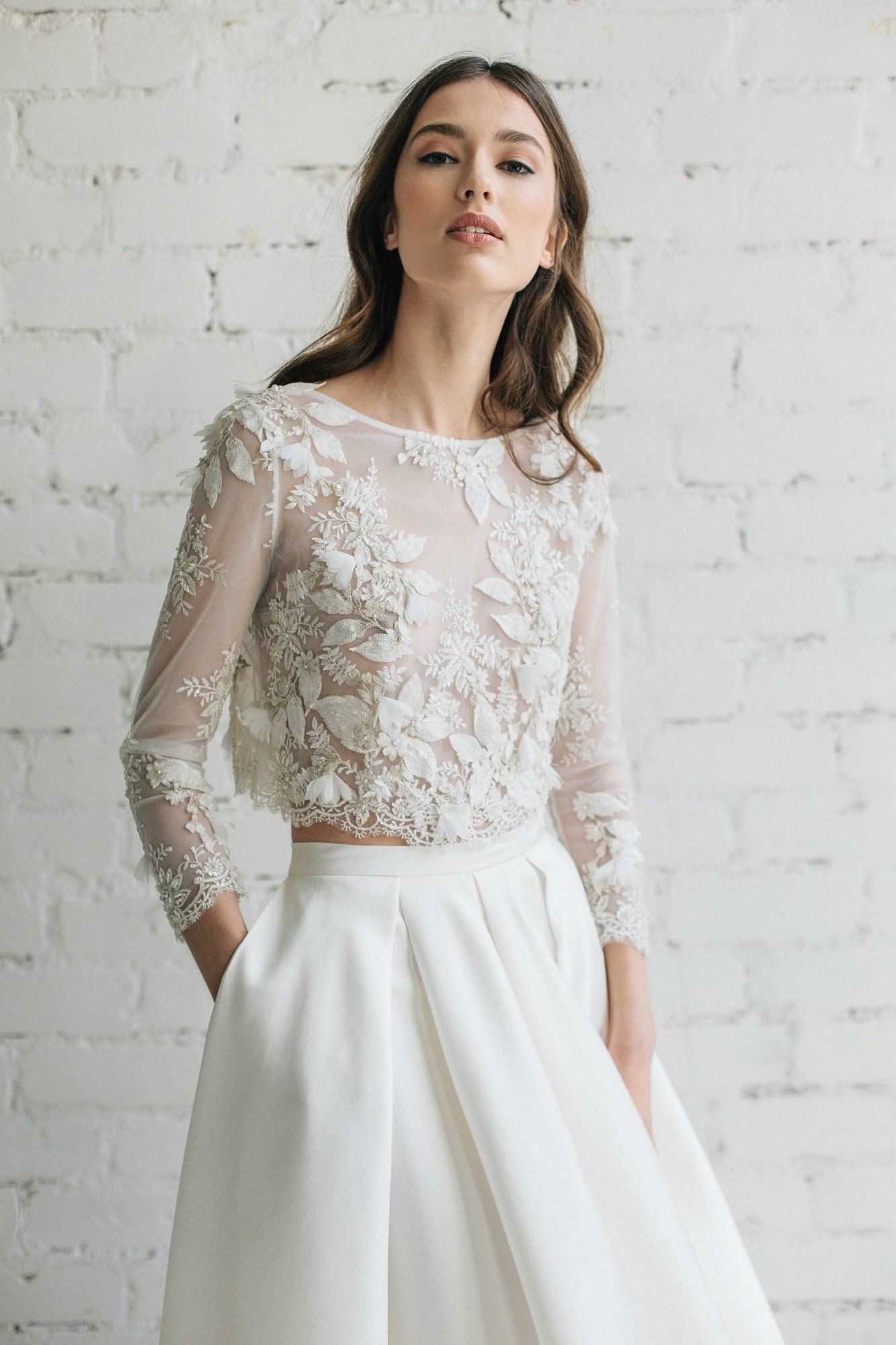 Кроп-топ с юбкой-карандашом сделает деловой образ более игривым. Для вечернего или свадебного комплекта лучше подобрать длинную юбку, это позволит вам выглядеть нежнее и женственнее. Будьте осторожны с выбором ткани — слишком плотная юбка будет визуально утяжелять ноги и бёдра.