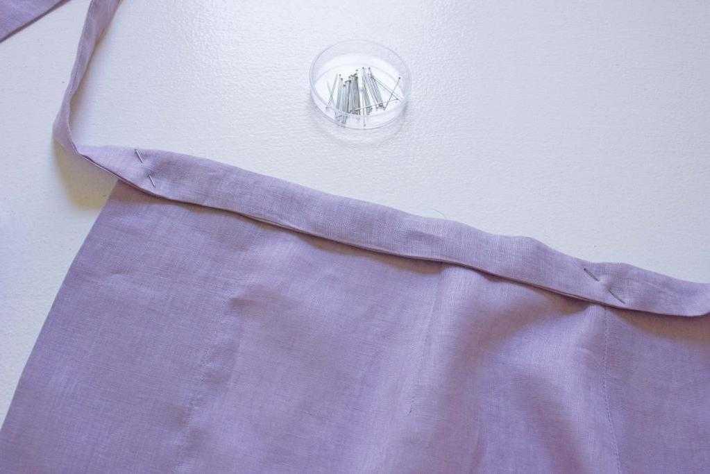 Приложите пояс к линии талии, сложив детали лицевой стороной друг к другу, совместите срезы. Отцентрируйте пояс по отношению к середине юбки, с учетом завязок пояс должен иметь большую длину, чем длина талии. Сколите детали булавками и пришейте на швейной машине.