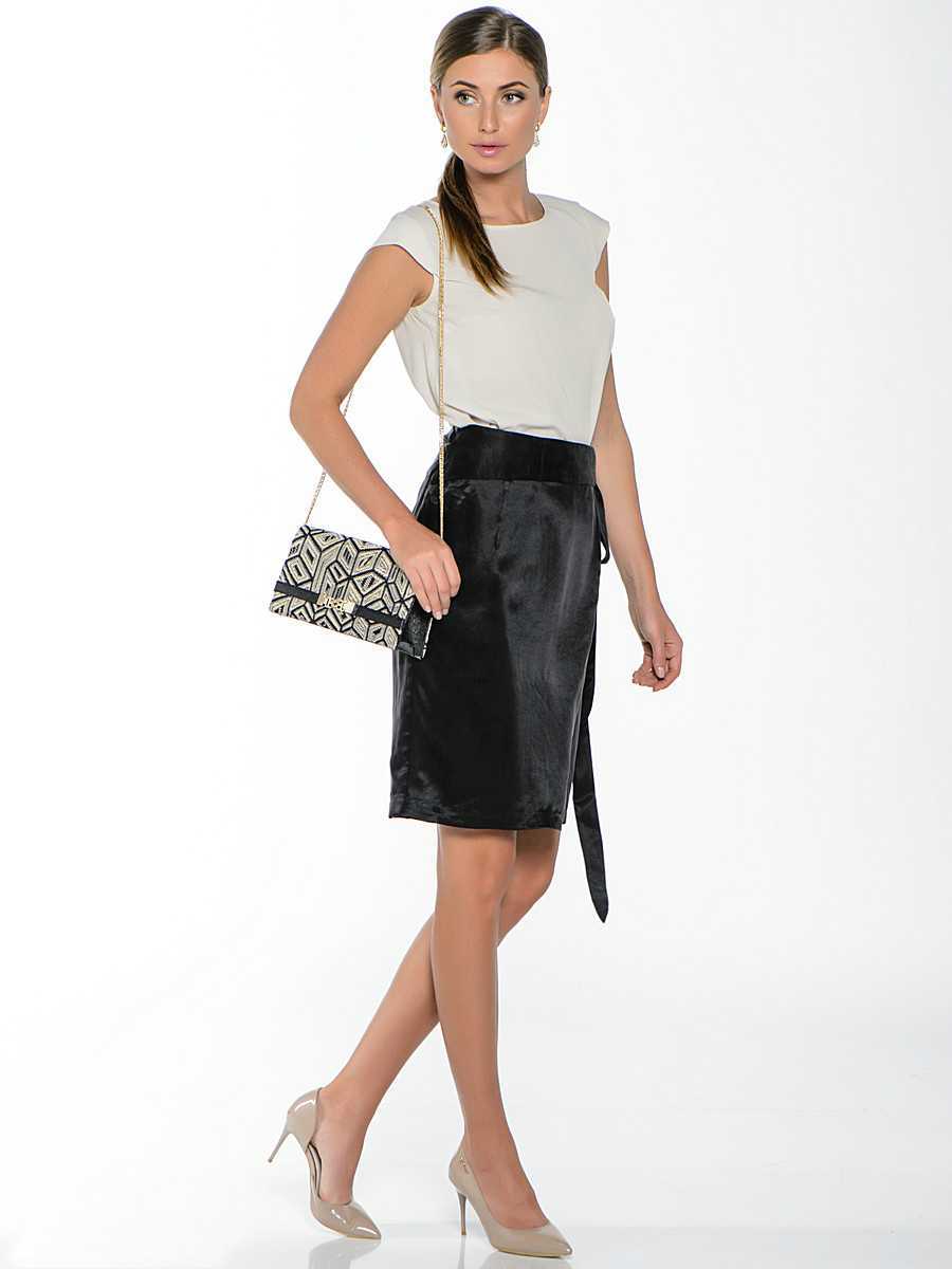Обувь на невысоком каблуке так гармонично вписывается в деловой стиль! Колоритность изделий с запахом предполагает сдержанность и минимализм при выборе дополнительных элементов. Избегайте ярких аксессуаров, чтобы не перегружать утонченный образ. Сумку лучше подобрать в тон юбке.
