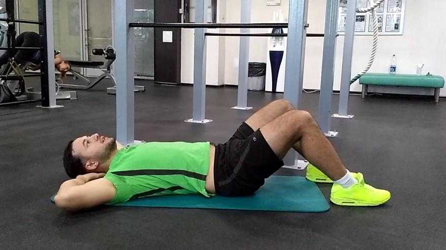 - Необходимо разместиться на полу в горизонтальное лежачее положение. Спина касается пола. Ноги согнуты в коленях – расстояние между пятками и ягодицами не меньше длины ступни. Руки скрещиваем за головой или в облегченном варианте вытягиваем вдоль тела. Мышцы живота находятся в напряжении.