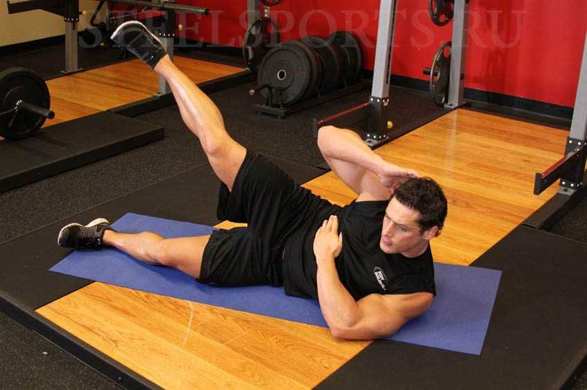 Более сложным вариантом выполнения боковых скручиваний на пресс считается одновременное поднятие ноги при сокращении мышц живота.