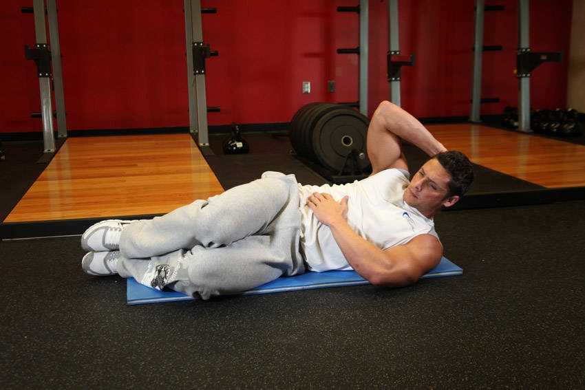 - отрывайте плечо от пола, пытаясь дотянуться локтем до противоположного колена;
