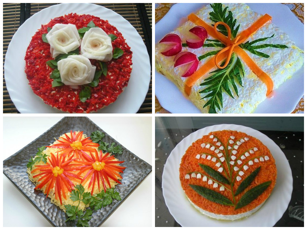Салаты, нарезки и холодные закуски нужно украсить ажурными элементами, бабочками, птичками, завитушками из овощей, фруктов. На салатах можно нарисовать кружева соусом, а на сладостях — глазурью.