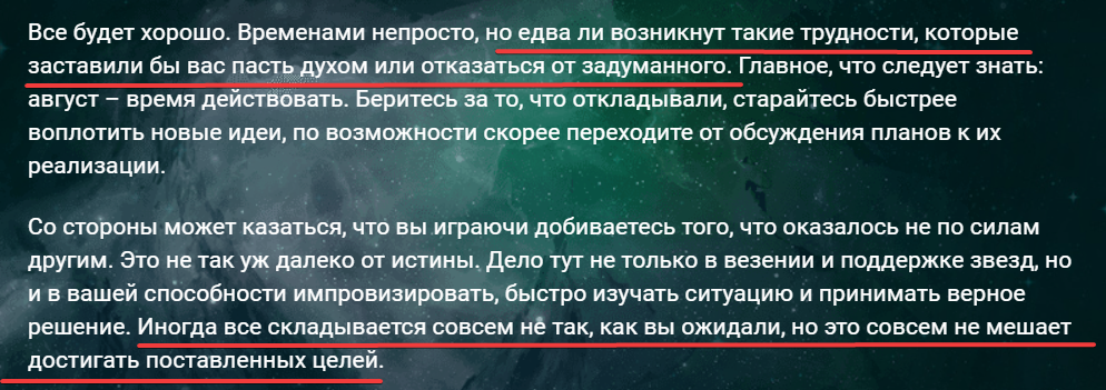 Именно из-за принципа Поллианны гороскопы не предсказывают только плохое. Все негативные предсказания будут компенсироваться положительным. Вот, например, что звезды обещали Стрельцам в августе 2021 года: