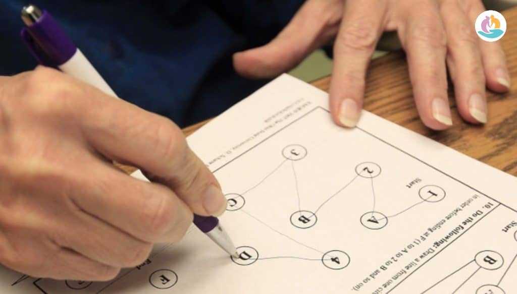 В пункте 10 на листе бумаги отмечают цифры 1, 2, 3, 4, 5 и буквы алфавита. В русском варианте берут буквы «А, Б, В, Г, Д». Требуется проводить линии от цифры к букве по возрастанию. В итоге должна получиться цепочка «1-А-2-Б-3-В-4-Г-5-Д».